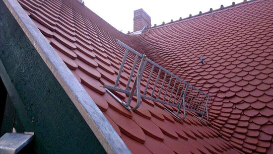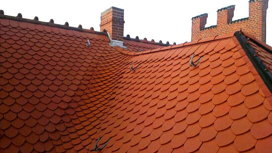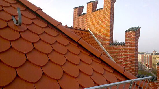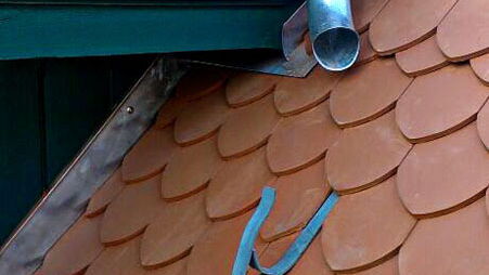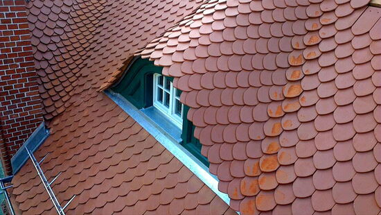 - neue Dacheindeckung - GOTHIC – Biberschwanzziegel mit deutsch eingebundener Kehle und Ochsenauge in Doppeldeckung straßenseitig