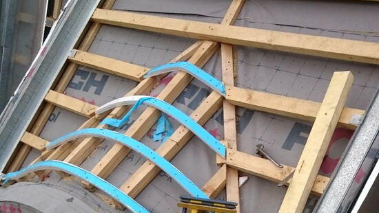 - Hofseitig Flachdachwarmpaket mit Einbindung in das Steildach, Schornsteinkopf-und Brandwandsanierung