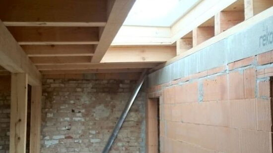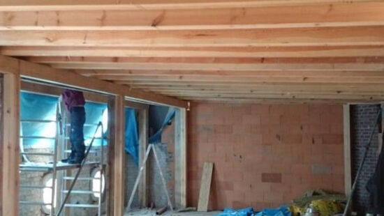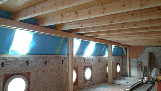 - Komplett neuer sichtbarer Dachstuhl, Holzart: Kiefer und OSB 4 Dachscheibe